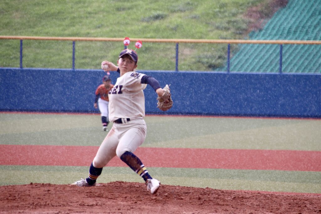 しかし、今大会無敗のチームCは諦めない。4回裏に宮﨑愛子のタイムリーで1点を返すと、5回裏には松口菜々子のタイムリーなどで2点を返して2点差。6回表に再び3点差とされたが、その裏に突然の通り雨の中、三木琉梨のタイムリー、そして松口菜々子のこの日4安打目のヒット&2本目のタイムリーなどで3点を奪い、7-7の同点に追い付いた。
