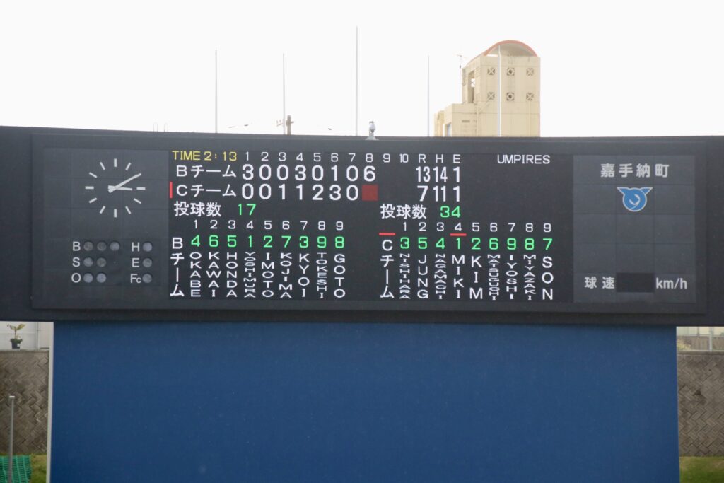 リードを手にしたチームのBの先発・原田美月は、1回、2回と走者を背負いながらも無失点で切り抜ける。3回裏にチームCのチョン・ダウンにタイムリー2塁打で1点を返されたが、直後の4回表に原田美月が2点タイムリー2塁打。自らのバットでリードを5点に広げた。