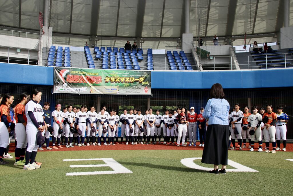 2025年12月17日、「国際女子野球クリスマスリーグ2025」の初日の全体練習が沖縄県の嘉手納球場で行われ、全国各地と海外から集まった47名が参加した。